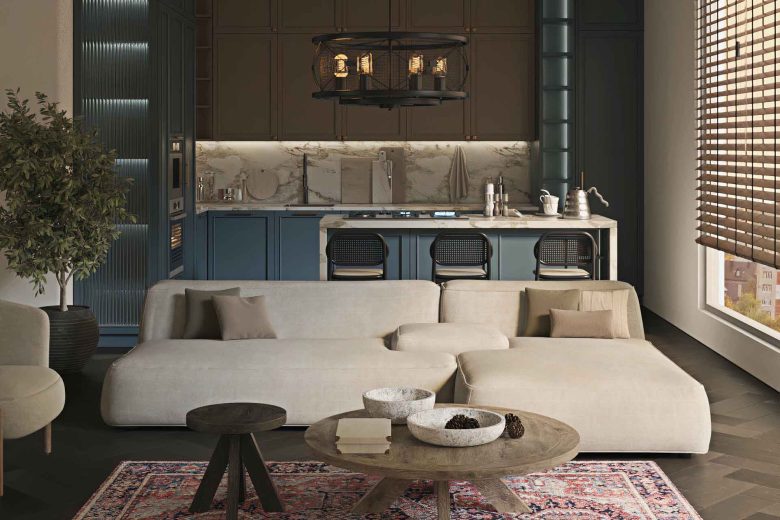 The south-facing aspect affords unimpeded views of the Alps. Measuring 42 square metres, with traditional Alpine woods, warm fireplaces, and natural-stone touches.